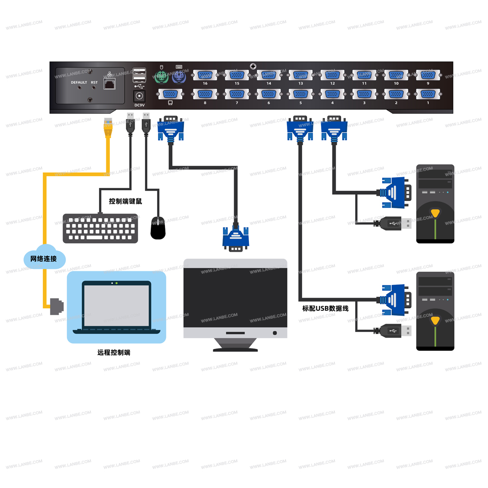 提供四種便捷方式,可切換安裝架構(gòu)中的電腦: (1)使用切換器前面板的連接端口選擇按鍵;(2)從鍵盤輸入熱鍵組合;(3)從屏幕顯示(OSD)的選單上選擇。自動掃描功能提供自動掃描,并逐一監(jiān)控安裝架構(gòu)中的電腦。(4)通過擴(kuò)展的IP模塊的網(wǎng)絡(luò)端口進(jìn)行遠(yuǎn)程的網(wǎng)絡(luò)控制操作連在KVM上面的電腦。